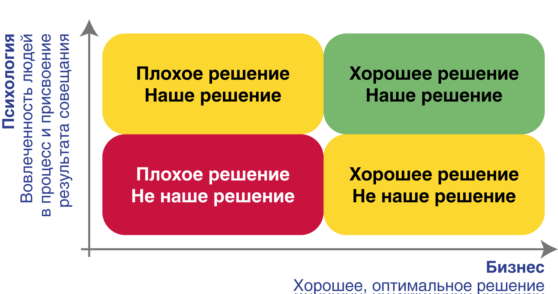 Обратите внимание: разделяемых и хороших. Решение по итогам совещания становится разделяемым, когда участники внесли свой вклад, их голос был услышан. После совещания они говорят «это наше решение», «мы это обсудили и договорились». Решение может быть и не разделяемым, когда значительная часть участников его не поддерживает. Второй критерий не менее важен — решение по содержанию должно быть хорошим, умным, оптимальным для бизнеса.