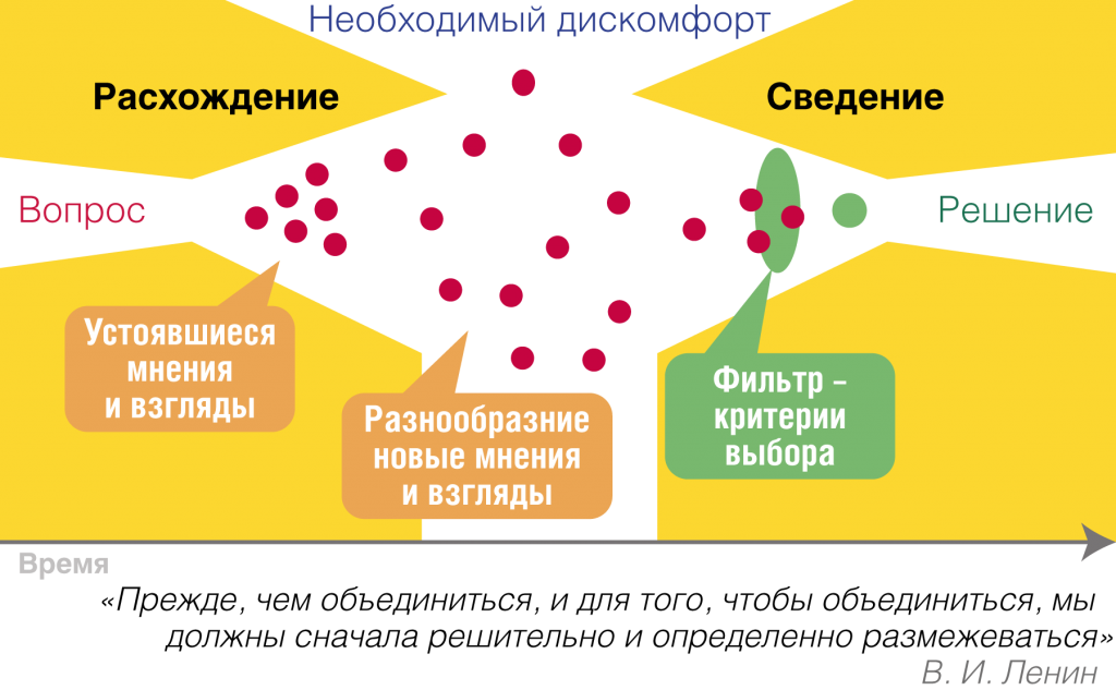 В своей книге «Руководствофасилитатора» другой замечательный мастер фасилитации Сэм Кейнер приводит основной принцип ведения дискуссий — сочетание дивергенции или расхождения и конвергенции или сведения.