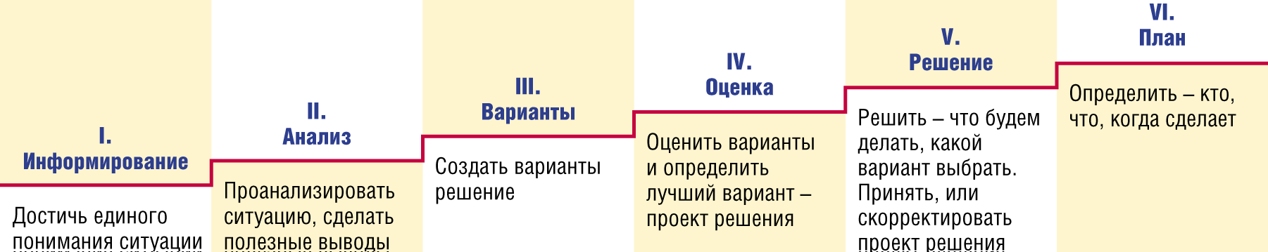 Вторая полезная модель — этапы принятия решения — дает возможность осознанно выбирать различные методы управления дискуссией в соответствии с конкретным этапом групповой работы.