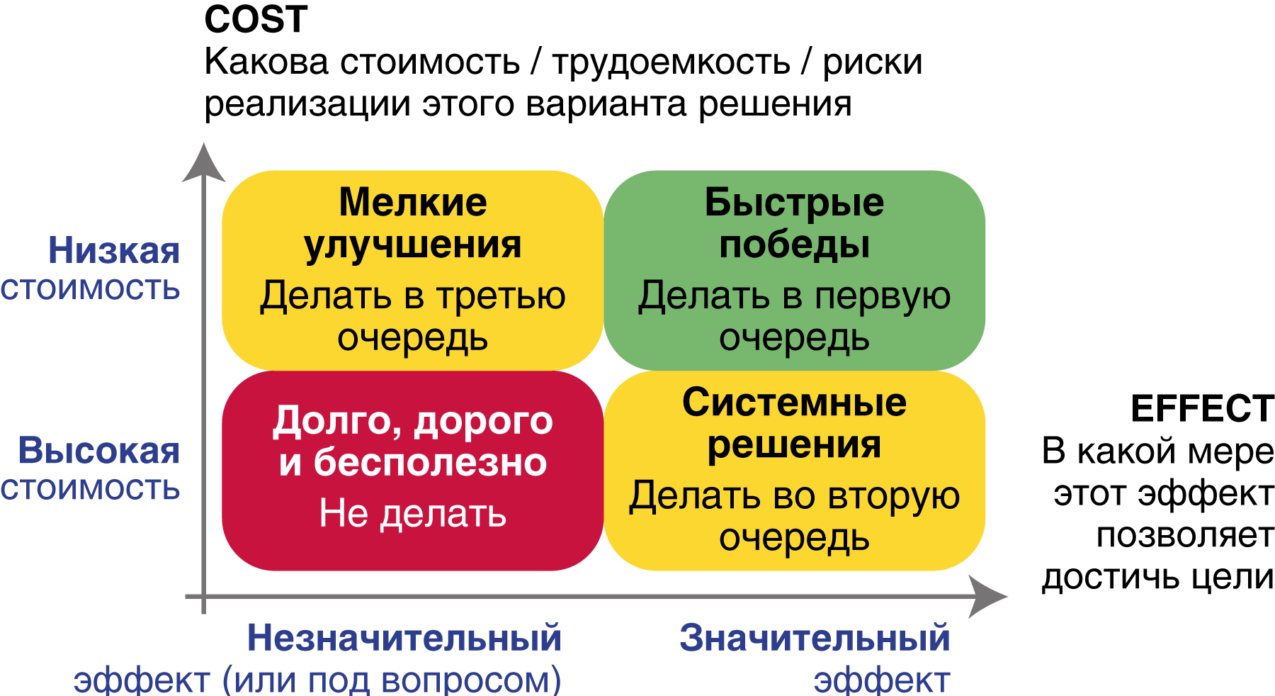 III. Создать варианты решения — можно провести классический мозговой штурм, когда каждый высказывается по очереди, все идеи записываются без критики и затем группируются. А иногда лучше собрать индивидуальные предложения участников, записанные ими на отдельных стикерах, и затем сгруппировать похожие предложения.