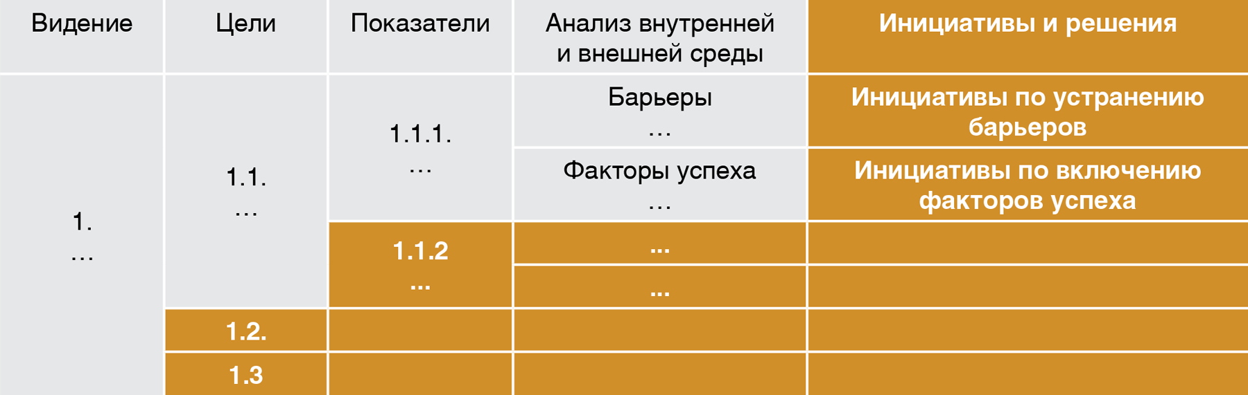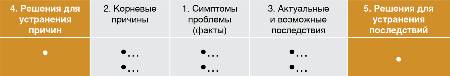 Каждый элемент шаблона может быть наполнен в свободной дискуссии или с помощью других методов сбора мнений с последующим сведением. После того как шаблон заполнен, можно переходить к обсуждению вариантов решения. В случае с проблемами решения могут относиться как к устранению причин, так и к снижению последствий. А в случае с целями и стратегиями обсуждаются инициативы для устранения барьеров и включения факторов успеха.