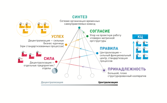 Для культуры силы характерна высокая децентрализация: каждая оргединица стремится отгородиться от другой и стать «натуральным хозяйством». Вместе с культурой правил обычно приходит централизация — формируется сильный корпоративный центр, который стандартизует все процессы и создает единую отлаженную армию, управляемую сверху. Культура успеха снова требует децентрализации — но теперь это децентрализация на уровне бизнес-единиц. Здесь характерно появление дивизиональной оргструктуры, в которой каждый дивизион — это отдельная бизнес-единица. Культура согласия возникает вместе с проектным межфункциональным и междивизиональным управлением. Именно с этого момента начинается сетевой менеджмент, где основой управления становятся временные команды, собранные под задачу. Ну и, наконец, культура синтеза, «бирюза» — это торжество самоуправления и сетей. Опять, как и в самом начале спирали, мы видим единую как бы неструктурированную организацию, которая на самом деле очень эффективно управляется за счет искусственного интеллекта, анализа больших данных, мониторящих систем и осознанных прямых публичных договоренностей между людьми, владеющими всей необходимой информацией.