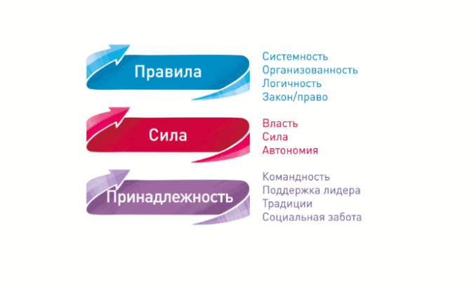 Например, если человек из культуры силы руководит людьми с ценностями принадлежности, конструкция работоспособна: сотрудники органично воспринимают авторитарный, патерналистский лидерский стиль руководителя, а он нормально относится к их семейности. Если же «отец семейства» вдруг начнет строить регулярный менеджмент (культуру правил), сотрудники из культуры принадлежности почувствуют себя некомфортно — им будет недоставать заботы, опеки, эмоционального лидерства и поддержки, эмоциональных «тычков», «пинков» и «наказаний», поскольку культуре правил присуща довольно отчужденная атмосфера. Помимо этого, обе культуры — и культура правил, и культура принадлежности — являются коллективистскими, что приводит к недостатку энергии лидерства — компания «заболачивается».