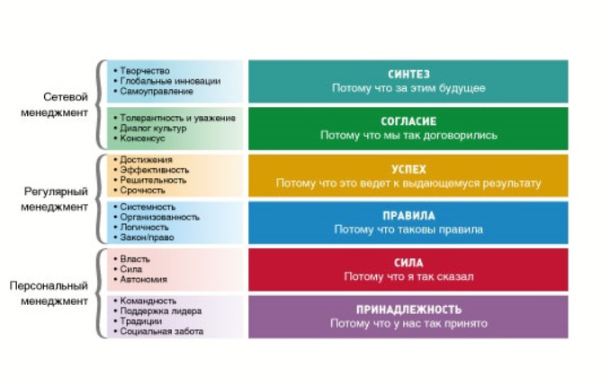 - Во-первых, ценность самоуправления. В культуре синтеза впервые происходит полный отказ от иерархии (в том числе исчезают постоянные лидеры команд) — сотрудники напрямую договариваются между собой во временных командах, при этом каждый может в какой-то момент взять на себя один из аспектов лидерства.
