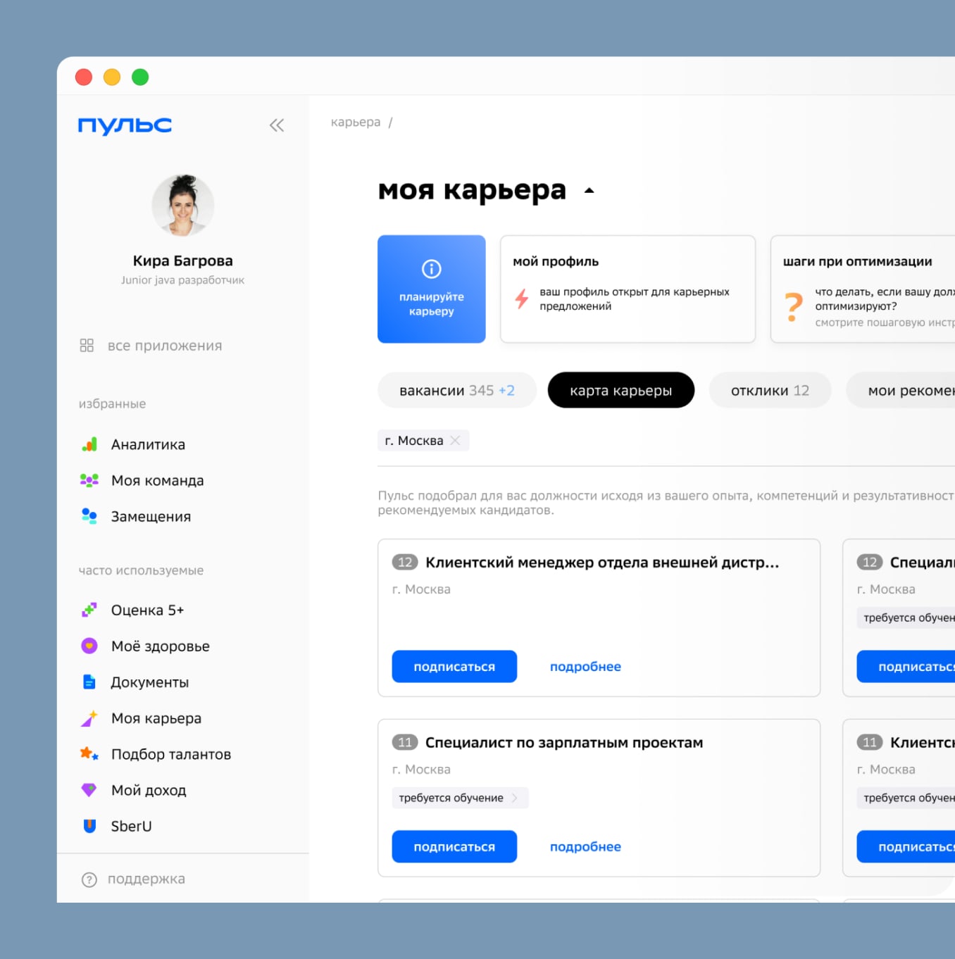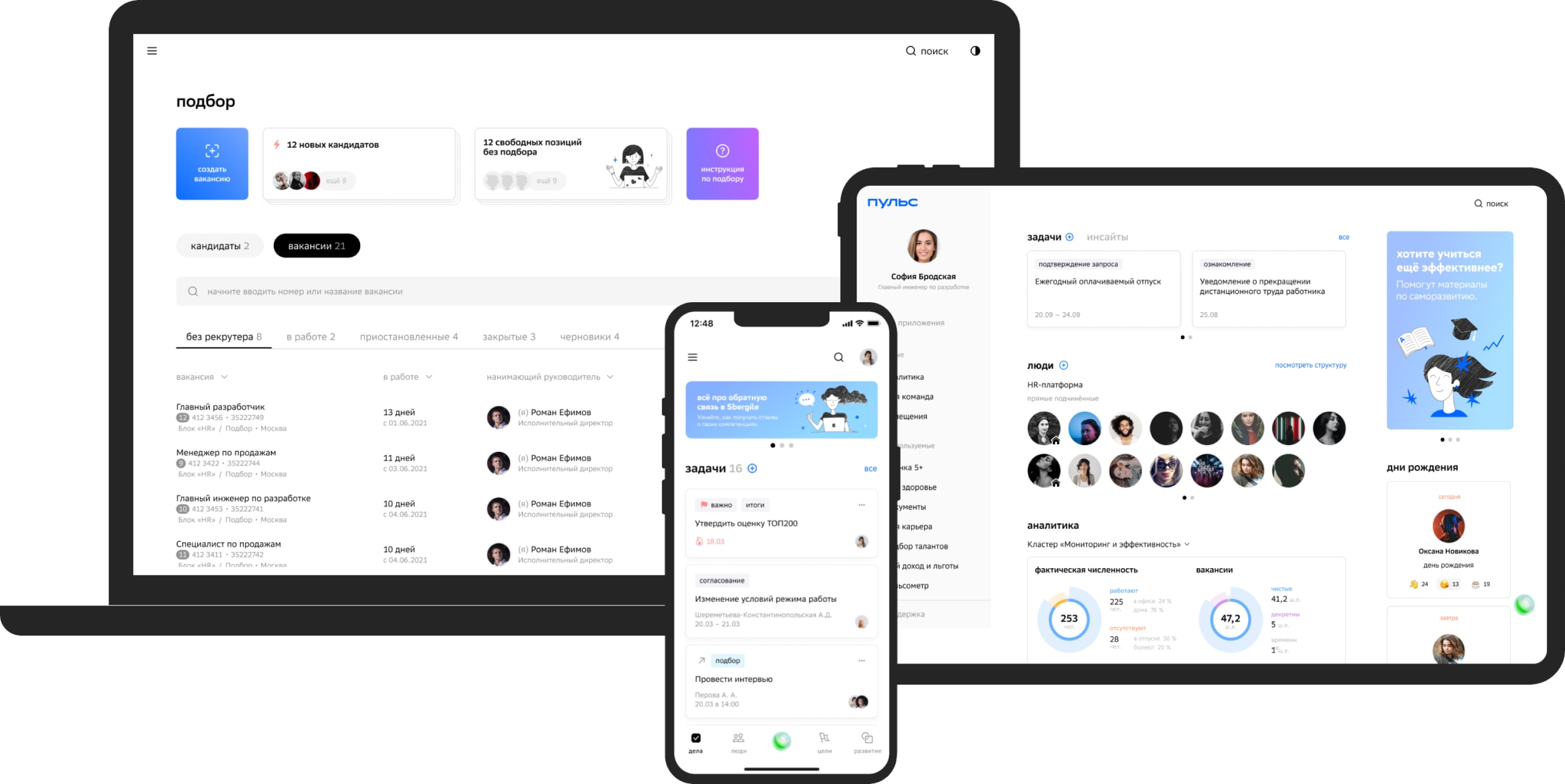 Пульс — единая платформа для всего HR-цикла: подбор, адаптация, целеполагание, обучение, обратная связь, оценка персонала, карьера и развитие, тесты и опросы, простые кадровые сервисы, сквозная HR-аналитика, внутренние коммуникации.