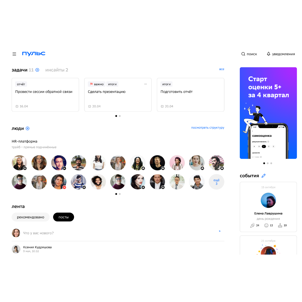 «Пульс» выполняет и функцию корпоративного портала с лентой новостей, информационными баннерами, сториз и инструментами обратной связи